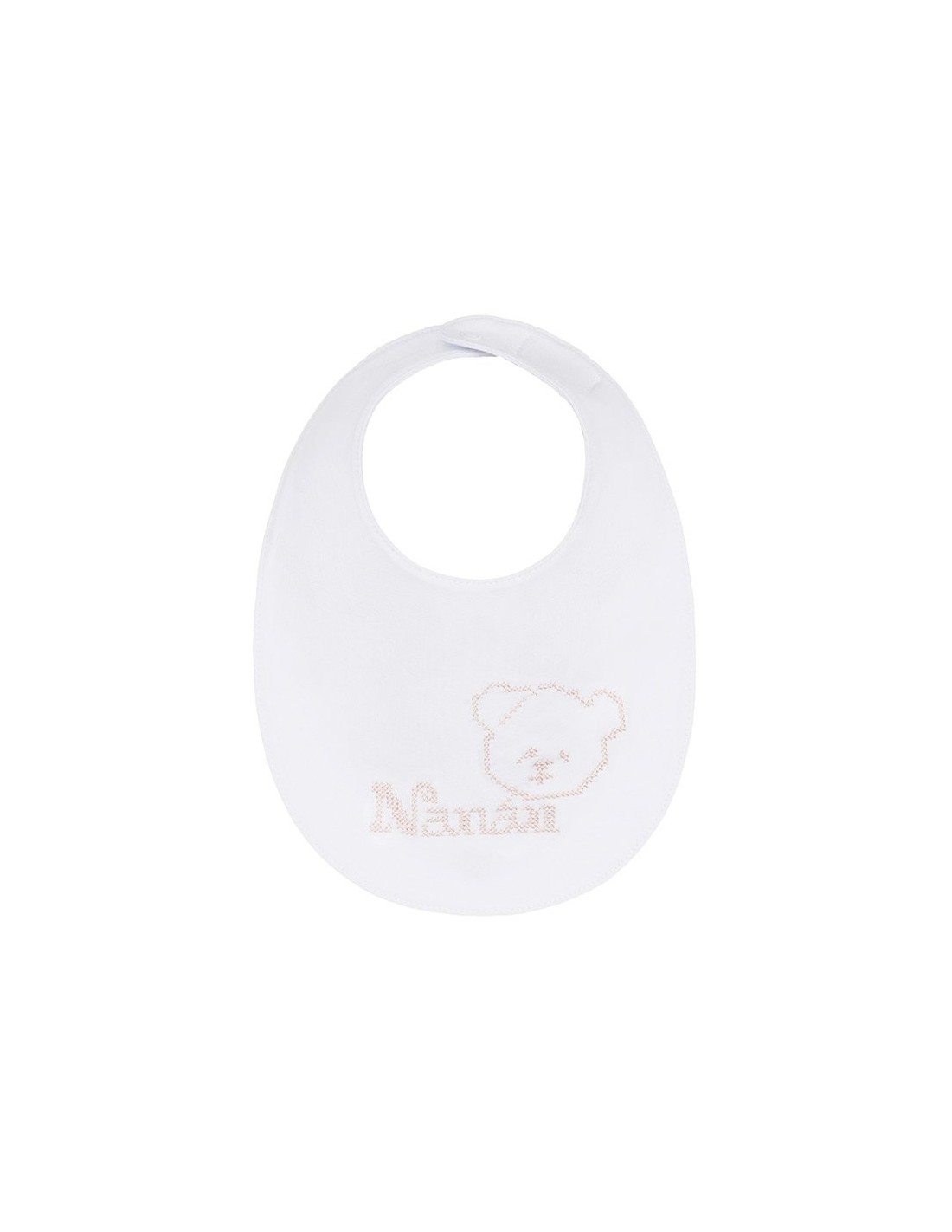 Grazioso bavaglino in jersey impreziosito dalla scritta “Nanán” e da un dolce orsetto con chiusura con bottone a pressione.