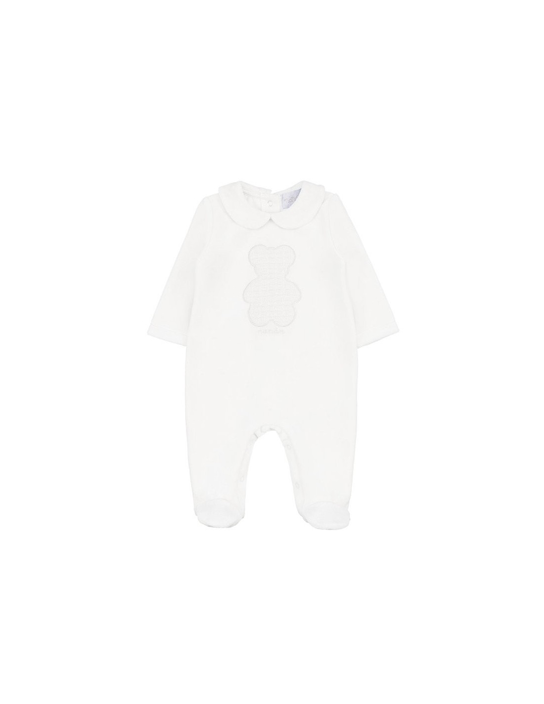 Deliziosa tutina in ciniglia con colletto arrotondato, impreziosita da un dolce orsetto. Abbottonatura inferiore e posteriore.