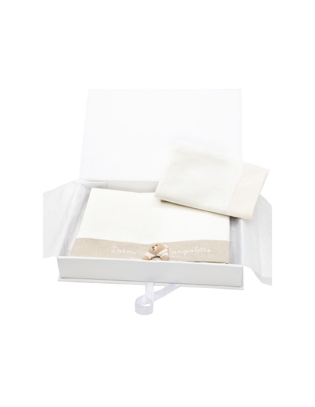 Il set lenzuola letto Nanan Tato è impreziosito dall’applicazione del piccolo orsetto Tato.